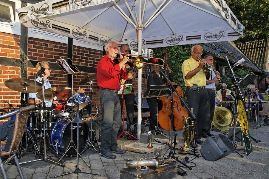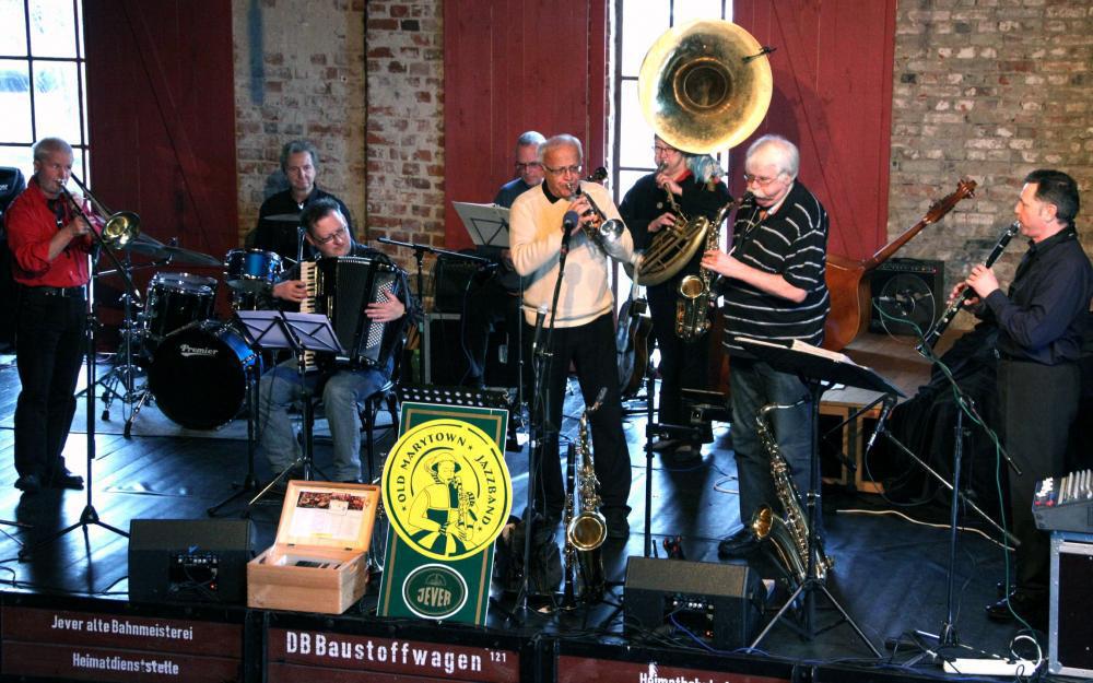 Gern habe ich auch immer wieder mit Kumpels Jazzfrühschoppen besucht, Kult war ja der Frühschoppen im „Cap Horn“ in der Lindenstr. in Oldenburg. Dadurch kannte ich auch einige Jazzmusiker; u.a. meinen Arbeitskollegen Ulfert Kaufmann. Dieser bedrängte mich, doch bei einer im Aufbau befindlichen Jazzband in Jever mitzumachen. Zunächst konnte ich mir nicht vorstellen, dass ich als alter Rocker nun jazzen sollte. Aber es fing an Spaß zu machen und einige Titel waren mir auch aus der Zeit der Rockmusik bekannt (z.B. Route 66, natürlich als Swing). Um den Bandleader Jochen Ewald aus Jever gruppierten sich viele Musiker, die als feste Besetzung oder als Gäste in der Jazzband „Old Marytown Jazzband“ musizierten. Es war auch von den Veranstaltungen her eine tolle Zeit, bis heute habe ich nicht mehr bei so vielen und unterschiedlichen Terminen musiziert. Von kleinen Kneipen und Clubs, Vereinen, Schwimmbäder oder Kirchen bis hin zu Großveranstaltungen (Jazzfestivals mit mehreren Bands) im Schützenhof Jever oder Allee-Hotel (Tivoli) Varel war alles vertreten. Toll waren auch die Jazztage während der Pfingsttage auf Borkum, drei Tage Musik in unterschiedlichen Lokalen.