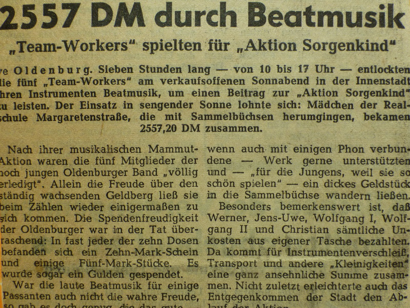 Januar 1971. Das Thema "Band" ist für mich nicht mehr präsent. Die Beatles sind auseinander und in Oldenburg läuft seit den letzten Soulkonzerten der Bremer Shakespeares im Gymnasium Eversten öffentlich wenig. Mit mir bin ich soweit im Reinen: Habe mich in die Azubi-Hierarchie der Bank mit Udo Warich, Heinz-Otto Griesel, Ingo Harms, Detlef Meier, Gaby Beilken, Gerda Schütte & Co. eingefügt. Bei Sprenger habe ich mir meine erste "Shadows"-Langspielplatte "Bestsellers" gekauft. Mit "Apache" drauf, wonach ich ab jetzt meine Gitarre stimme. Verfüge über ein kleines Sparguthaben. Meine Freundin besucht die Oberstufe des Graf Anton Günther-Gymnasiums und hat meinen alten Spezi Klaus-Peter in der Klasse. Meine Alten daheim sind meist friedlich. Demnächst beginne ich mit Führerschein-Stunden. In der Berufsschule haben mein Freund Günther Nullmeyer und ich uns wiedergefunden und sitzen zusammen. Ein gutes Omen. Die Lehrer sind entspannt, betrachten uns als Menschen und gehen positiv mit uns um. Infolge des allgemeinen Wohlgefühls stimmen auch die Noten. Günther und ich können uns vorstellen, auch mal Berufsschullehrer zu werden. Kurz um: Alles easy. Bis eines Tages, in den "Städtischen Handelslehranstalten" an der Ammerländer Heerstaße .. Günther und ich schlendern auf dem Pausenhof, und Günther begrüßt ein auch mir bekanntes Gesicht aus Hindenburg-Schule-Zeiten. Nach dem Small-Talk zwischen den beiden "na Christian - was machst Du so" wendet sich unser "Bekannter" an mich. Sinngemäß: Spielst Du nicht Gitarre? Wir haben 'ne Band. Ganz starke Truppe mit Chorgesang. Anlage sowieso. "Verstärker - hast keinen? - macht nix - komm trotzdem. Wir proben wöchentlich in einer speziellen Garage Nähe Alexanderhaus beim Fliegerhorst. Jetzt Samstag wieder. 14 Uhr da sein." Ich überlege: Samstag Nachmittags bin ich wie immer bei meiner Freundin. Okay, diesmal verspäte ich mich. Is' ja ein besonderer Anlaß. (Und ob). Also radel ich am Samstag aus Richtung Hauptstraße Eversten nach Bürgerfelde in Richtung Fliegerhorst. Gitarrentasche am Lenker, Kabel in der Jacke. Der Klassiker eben. Bis auf das Radio, das durfte zu Haus bleiben. Alexanderhaus - Garage - Leute da - Begrüßung: "Schön, das Du da bist. Wir sind die Teamworkers".